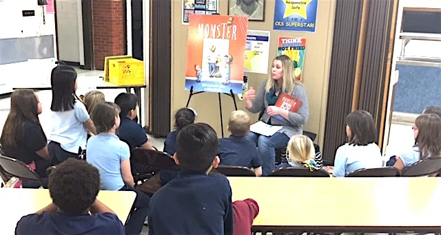 The students were delighted with special guest, children's book author, Laura Jensen Kimball. Laura read her latest book, "Momster." She spent time talking to the students about her book and answering curious questions the kids had for a real life author. The students were very inquisitive asking about many aspects of the book including, "what is it made out of?"